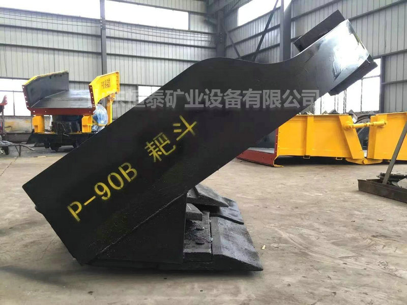 2、尾輪:是懸掛在固定楔套環(huán)上,用以引導(dǎo)耙斗的返回迎頭,主要由側(cè)板、耐磨繩輪、吊鉤、芯軸和軸承所組成。耙斗是在主繩、尾繩牽引下作往復(fù)運(yùn)動(dòng),扒取巖石,耙角為60°,平斜巷道通用,是耙?guī)r機(jī)扒取巖石的主要工具,耙齒采用耐磨的高錳鋼材質(zhì),磨損嚴(yán)重后可對耙齒進(jìn)行更換。