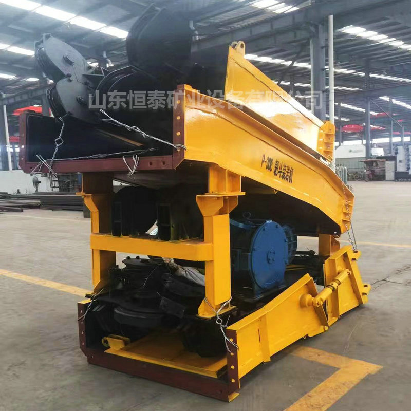 在P-30B耙斗裝巖機的臺車上,安裝有絞車的兩個滾筒,它們在電動機的驅動下,分別牽引著主繩和尾繩,通過主繩和尾繩操縱著耙斗作往復運動,由簸箕口擋板導向,將巖石扒進進料槽內,經過中間槽,在卸載槽尾部的卸料口把礦石卸入下面的礦車之中,如此反復,將礦車裝滿,從而實現裝巖。
