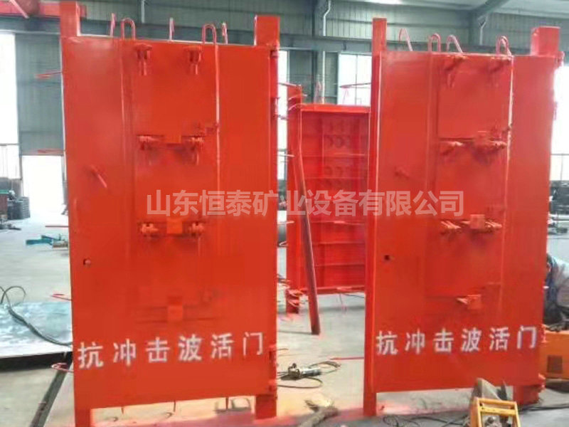 抗沖擊波門由抗沖擊波活門和抗沖擊波密閉門組成,用于井下材料庫和材料發(fā)放硐室,起隔離作用阻止沖擊波及產(chǎn)生的火焰、有毒氣體向外部巷道擴散,由總回風(fēng)道排出。抗沖擊波活門起抗沖擊波、調(diào)節(jié)庫房所需風(fēng)量和隔離作用。